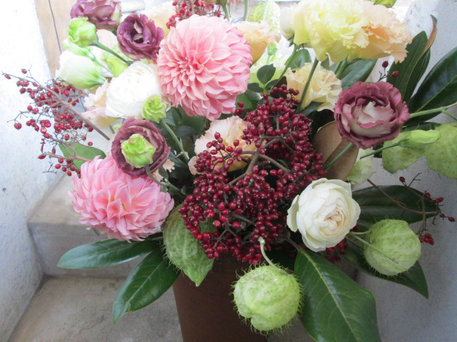 このまま全部ドライになるものばかり、葉物もゆっくりセピア色に~ずっと飾っていただけます(^^♪