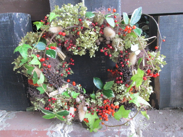 秋の実リース 野バラの実・つる梅もどきの実・アナベルなど々を使いました